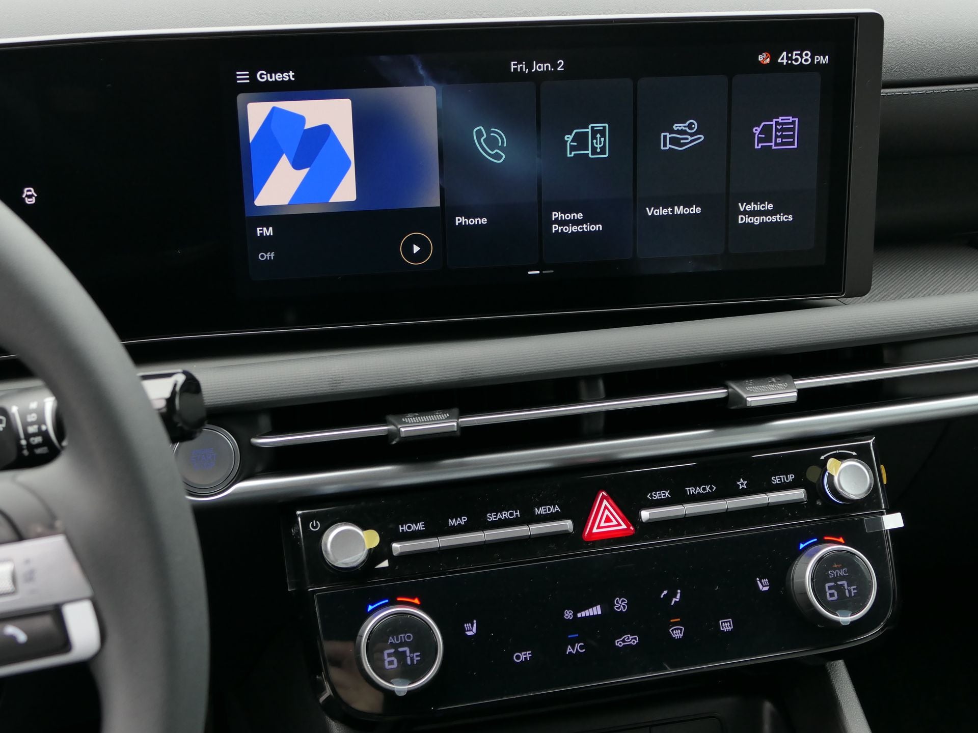 - Radio: AM/FM/HD Audio System -inc: 12.3" color touchscreen display (ccNc lite), 6 speakers, Blue Link+ connected car system, SiriusXM satellite radio w/3-month trial subscription, wireless Apple CarPlay and Android Auto integration, Over-the-Air (OTA) software updates (controller and multimedia) and USB connectivity